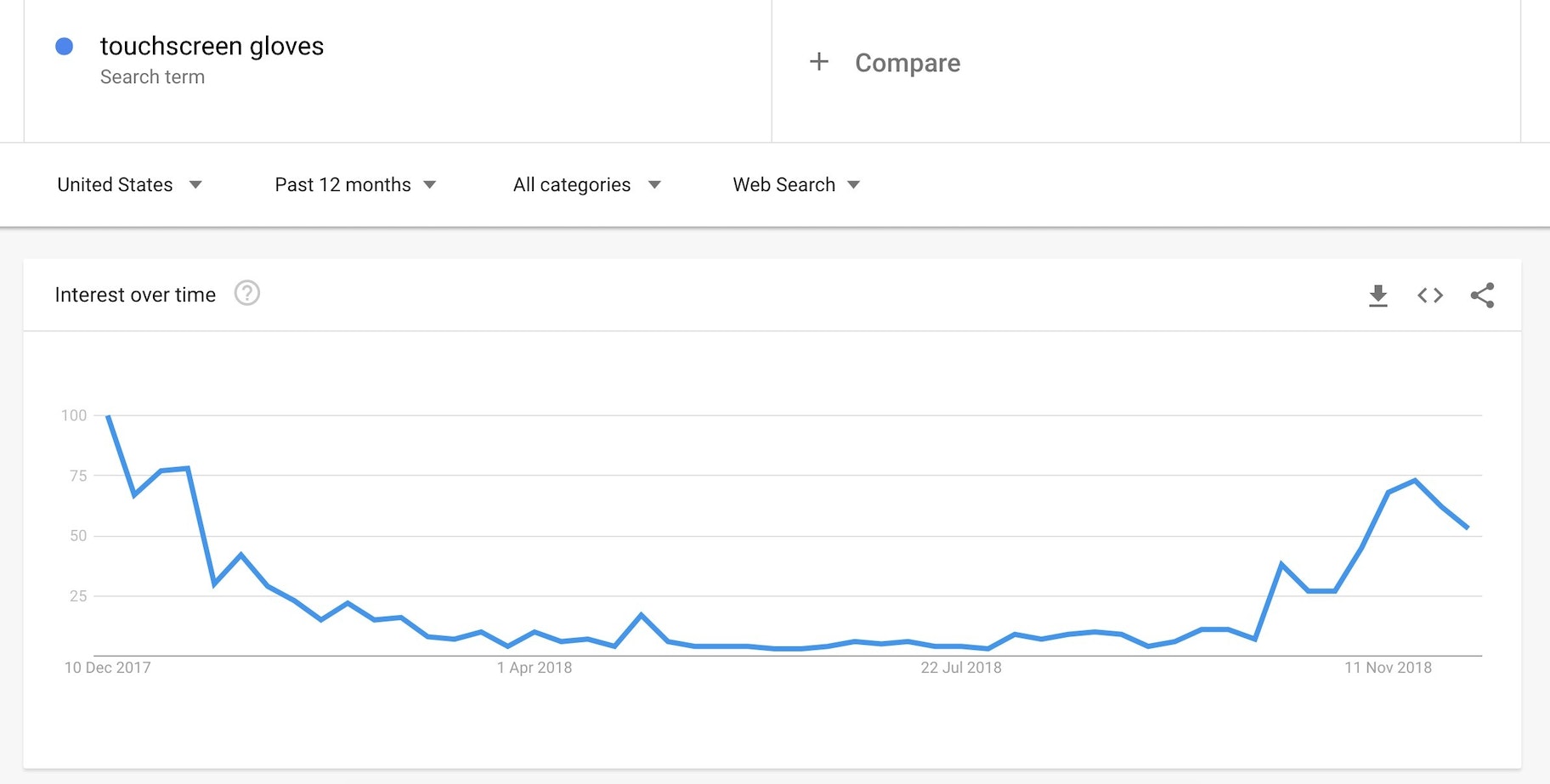 所以,让我们把“触摸屏手套”添加到谷歌趋势中,看看我们会发现什么。