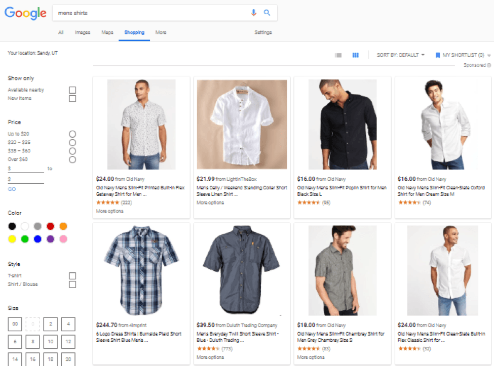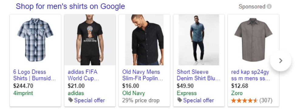 谷歌购物广告是当你寻找某种产品时,你在搜索引擎结果页面顶部看到的选项。下面是一个搜索男士衬衫的例子: