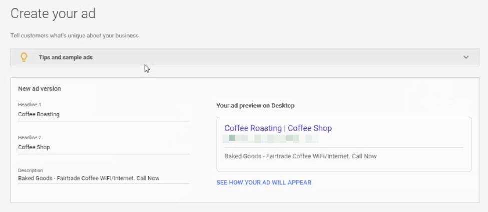 一旦你完成了对产品或服务的定义,下一步就是制作最终的广告。在下一个屏幕上,您将能够编辑广告的副本,并最终确定它在搜索引擎结果页面上的显示方式。