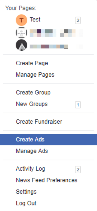 一旦你登录了你的Facebook账户,前往你的新闻源右上角的下拉菜单。你需要点击“创建广告”选项。