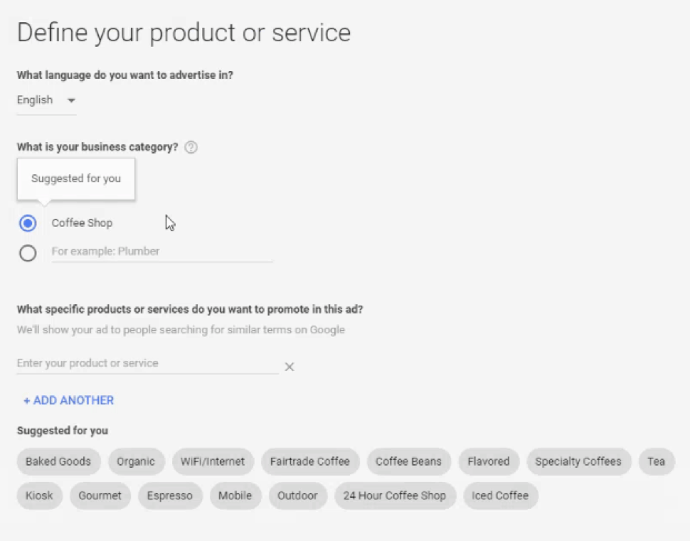 一旦你确定了地点,你就需要进一步定义你要卖的是什么。根据网站的内容,谷歌广告会建议你可以包括的产品和服务,帮助缩小或扩大你的受众。
