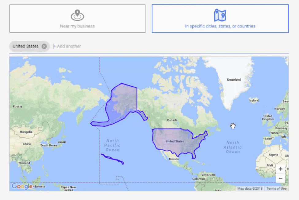 从这里,你需要选择你想要投放广告的地理位置。这个范围可以很宽也可以很窄,只要你想要。