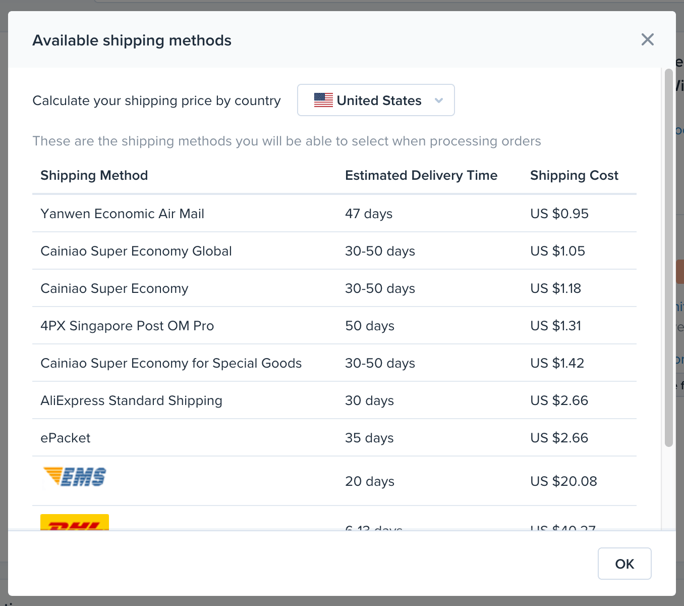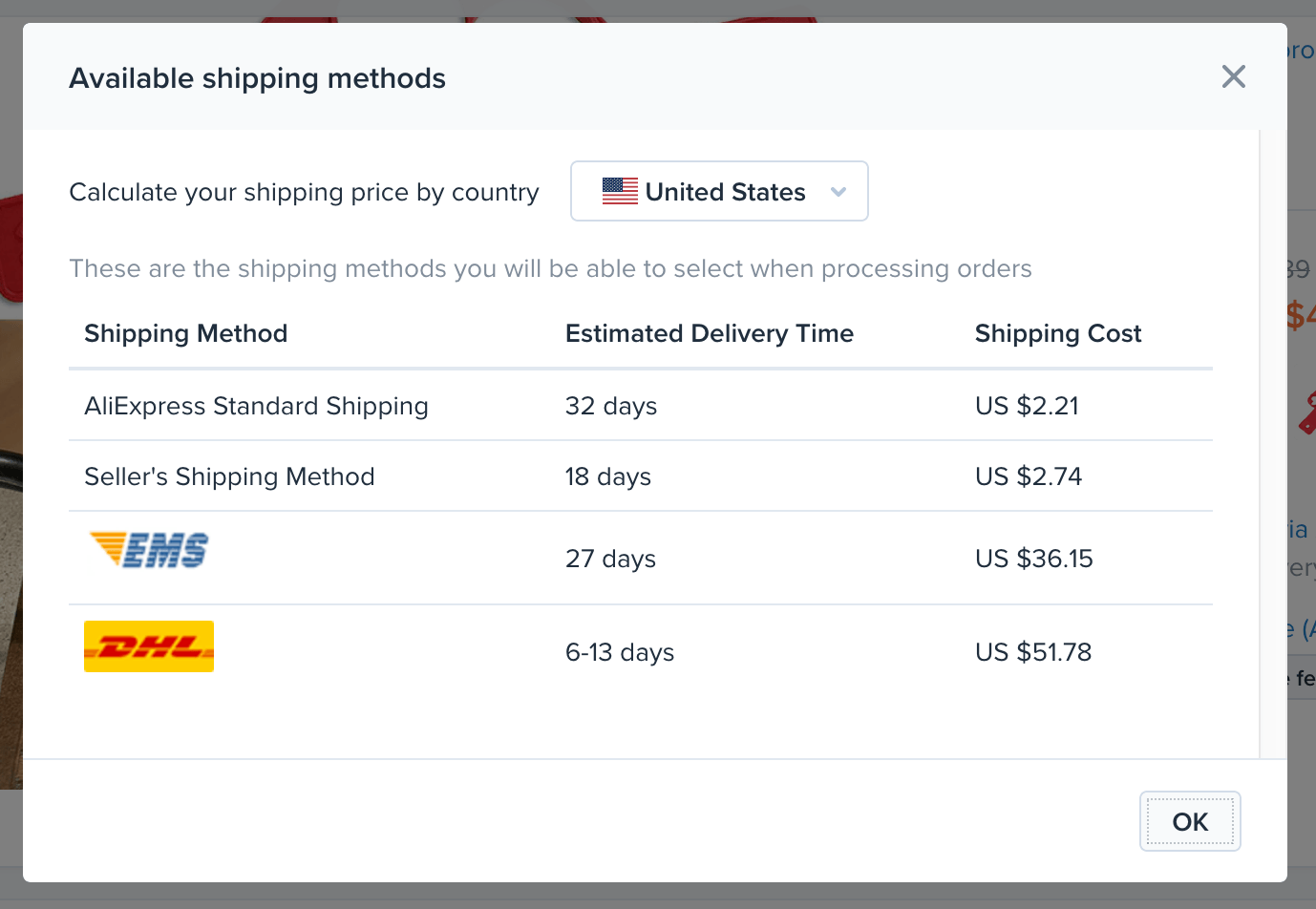 如果你从全球速卖通上发货,你也可以使用他们的发货选项。速卖通标准运输通常是低成本的,有时是免费的,在15到45天内将包裹送到全球各地。