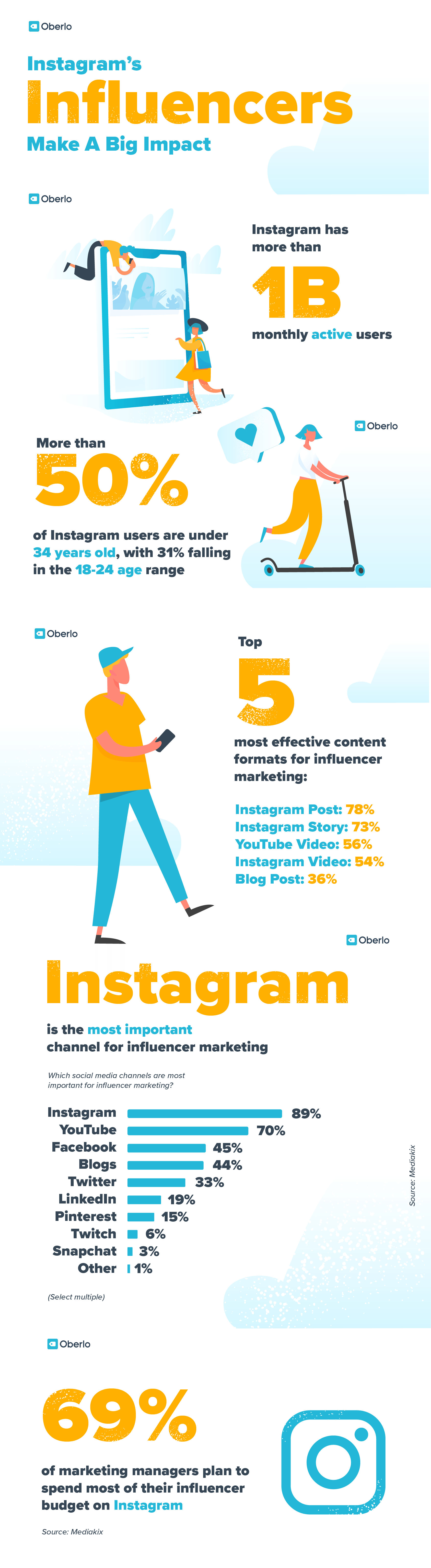 到目前为止,最有效的网红营销形式是Instagram上的帖子和故事。Instagram的平均参与率是2.21%。