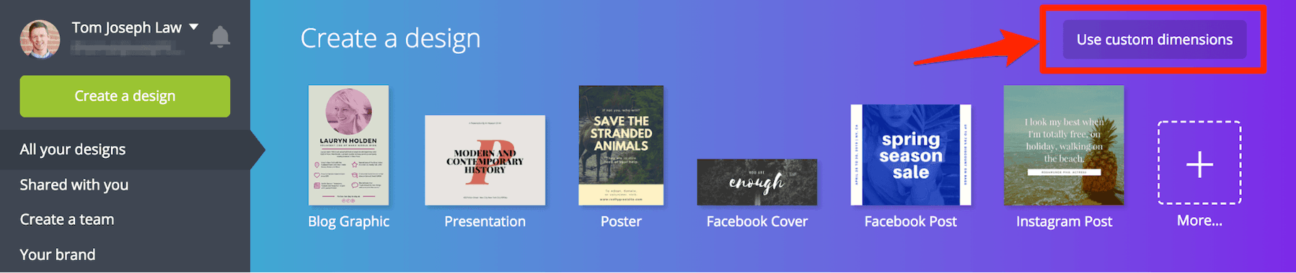 简单的创建帐户,登录,然后点击“创建设计”。然后,单击“使用自定义维度”,而不是选择其中一个模板。