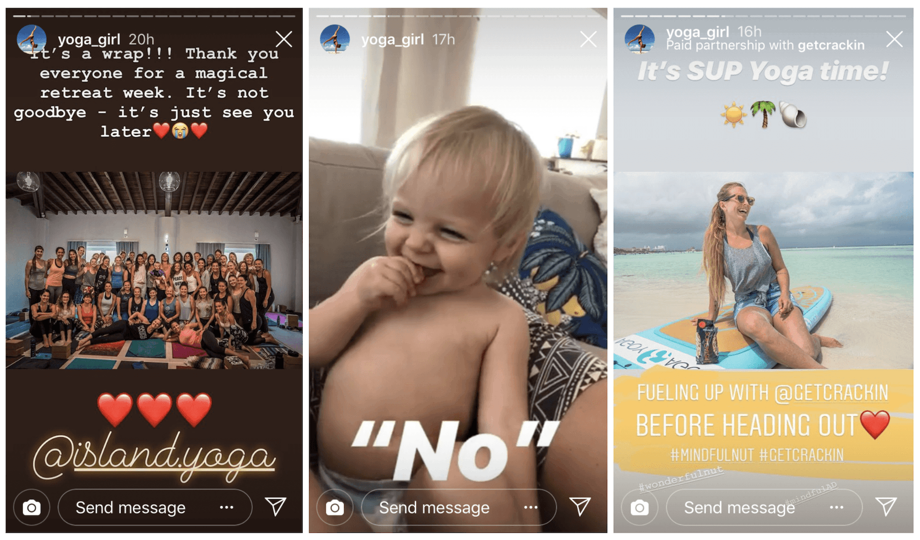 瑜伽的女孩共享不同类型内容的混合。下面的图片展示了一组瑜伽课程、家庭时间和一个赞助帖子。