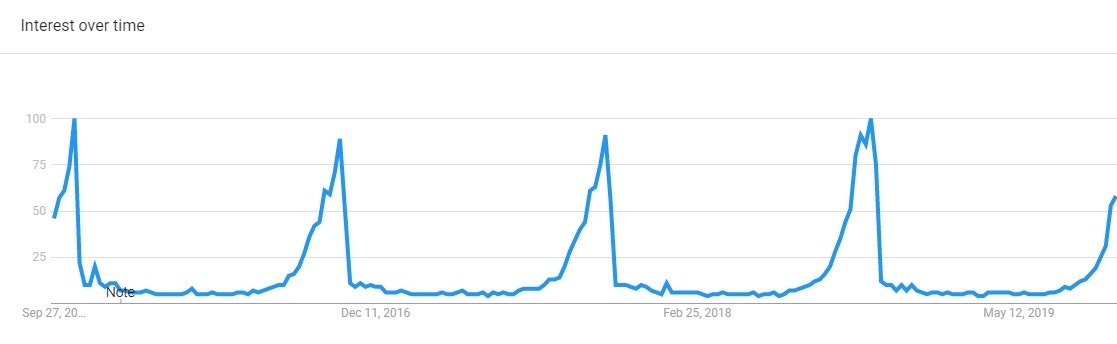最后,谷歌趋势可以向我们展示产品生命周期是如何随着季节的变化而起伏的,如下图所示,搜索词“狗装”的趋势: