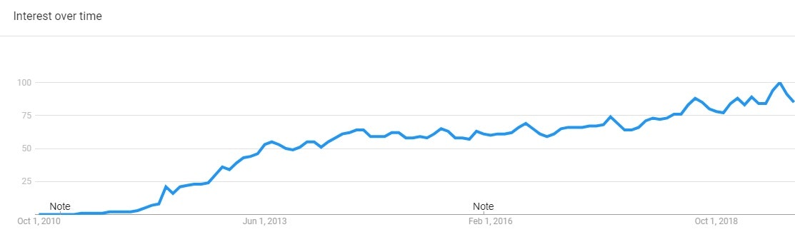 查看谷歌趋势的特定搜索词可以帮助你确定产品可能处于哪个阶段。谷歌趋势通过量化一个词的搜索次数来工作。