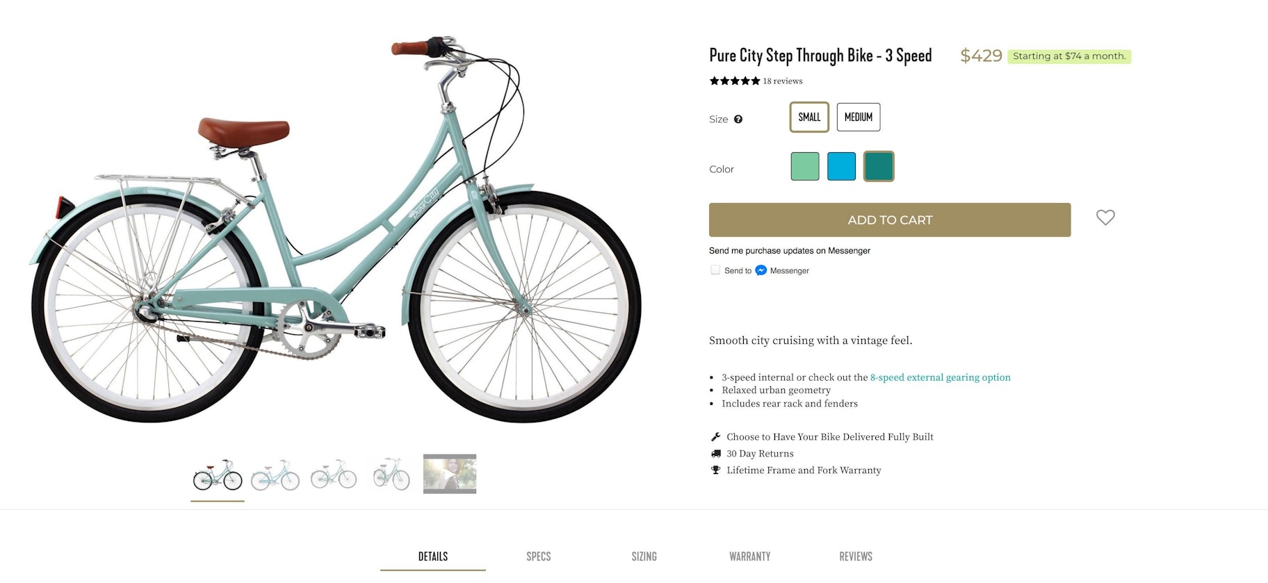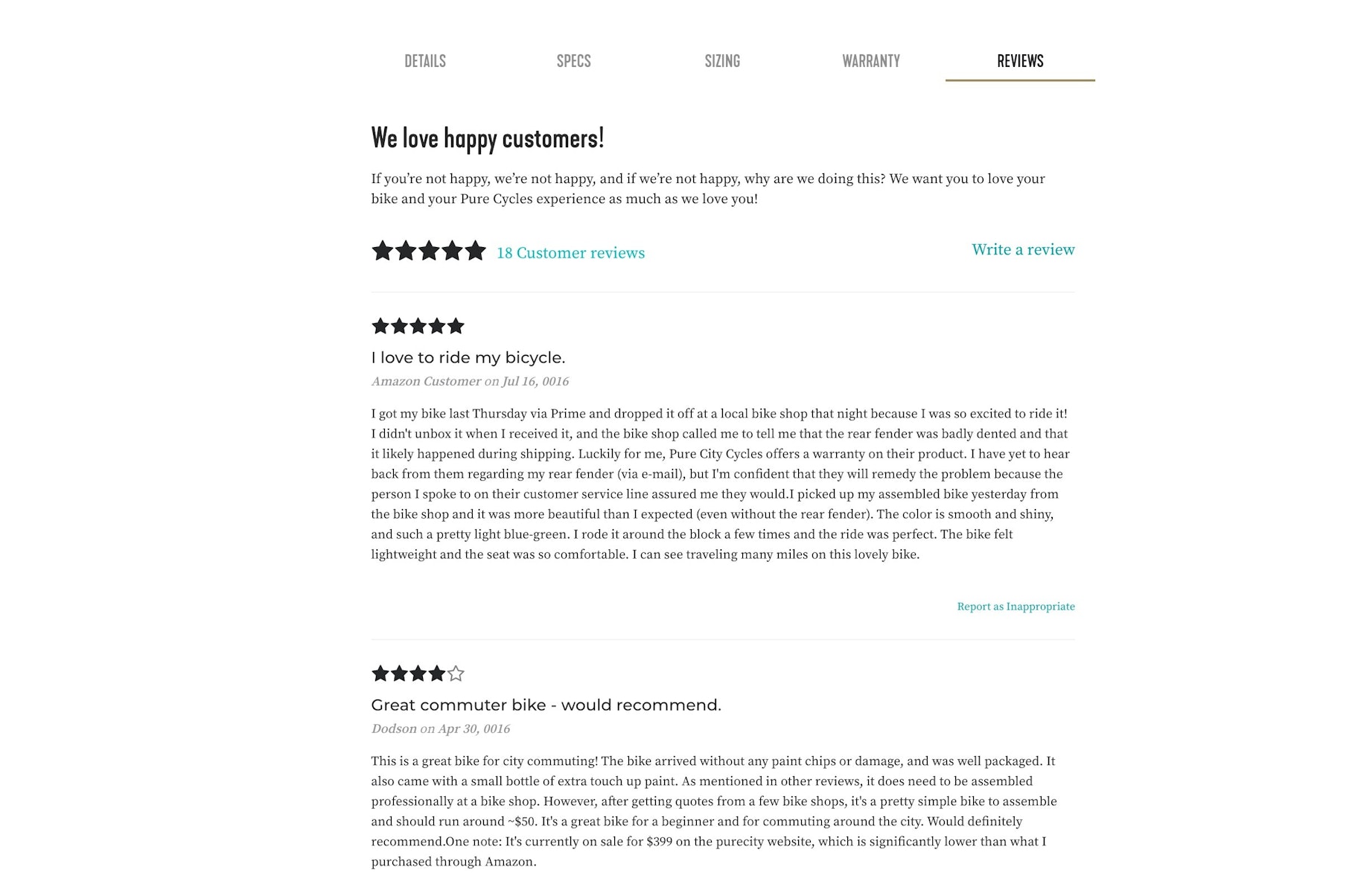Pure Cycles产品页面的其余部分可以预见是美丽的。Pure Cycles加载了客户评论、照片、社交媒体插头和运输细节——这些东西绝对不适合放在旁边添加到购物车按钮。