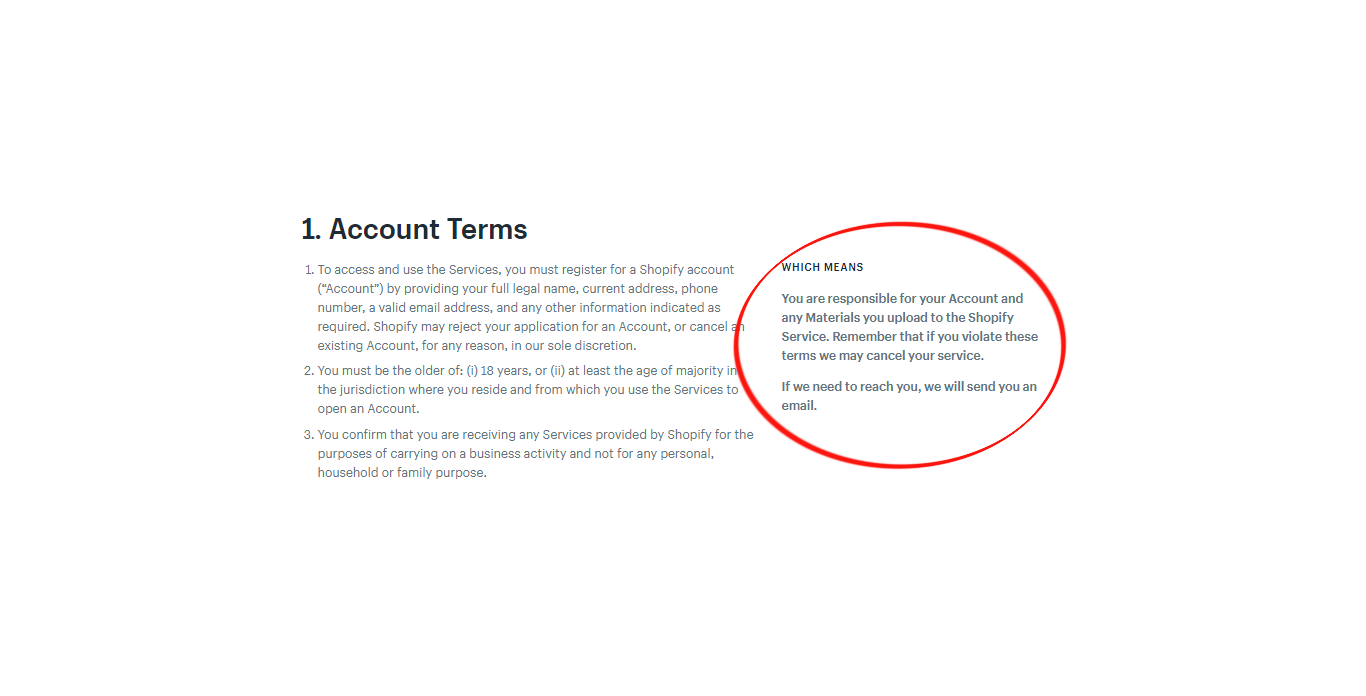 浏览和阅读其他网站上的用户协议条款,了解其中包含的术语和内容,这不是一个坏主意。Shopify是一个很好的例子,因为它在每个从句旁边都有“日常用语摘要”。