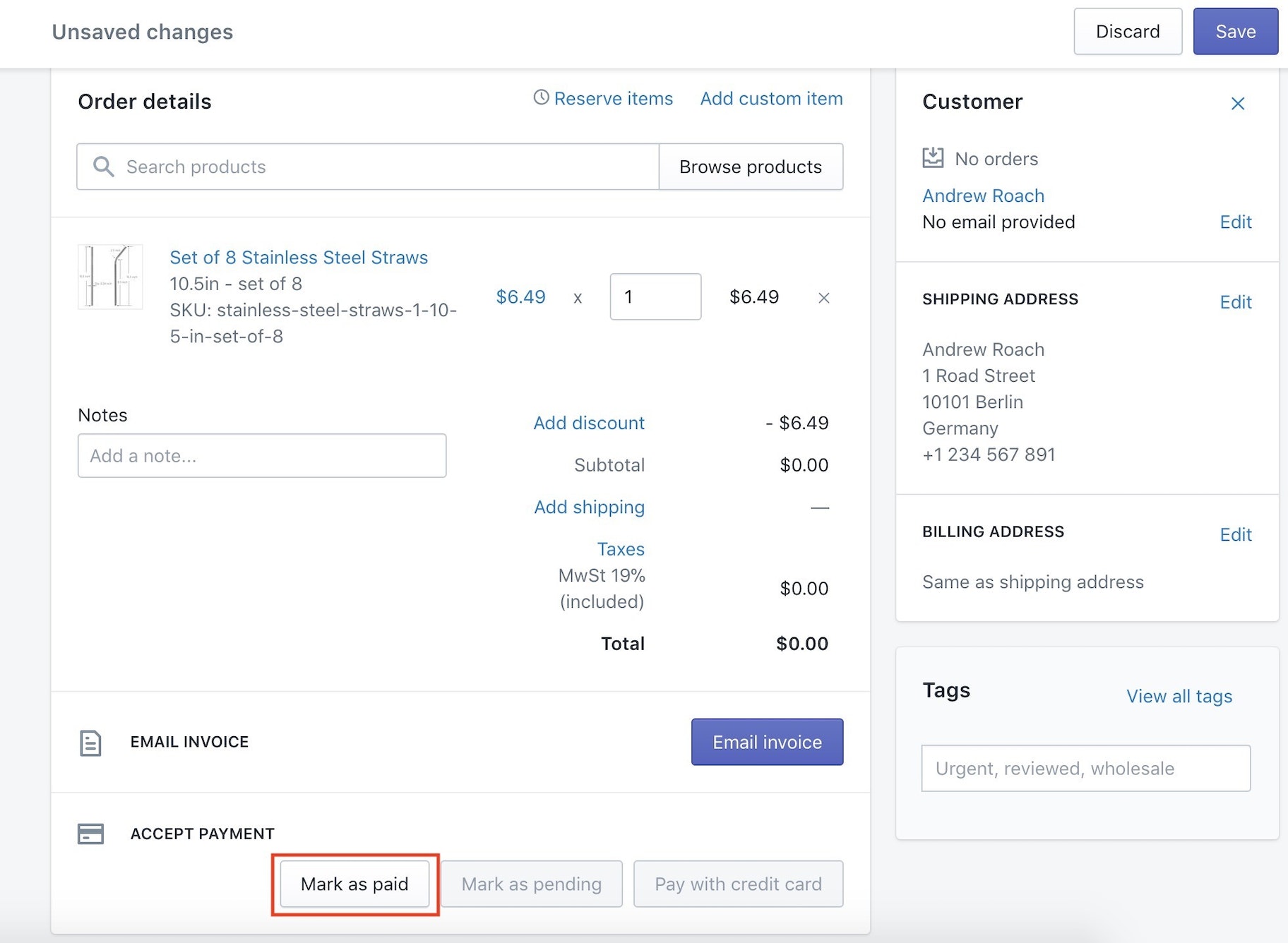 一旦你给商品打了100%的折扣,你会注意到“用信用卡支付”和“标记为待定”按钮现在会变成灰色。检查一切是否正确,然后你需要点击“标记为已付费”按钮继续。