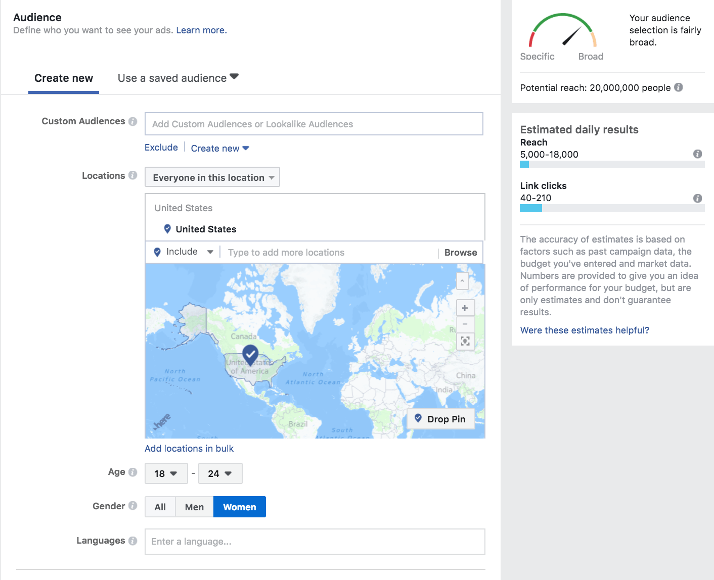 例如,如果您想要特定于国家的赞助消息,您可以在高级选项下进一步按国家对受众进行排序。您不能更改位置,因为赞助消息的唯一目的地是Messenger收件箱。