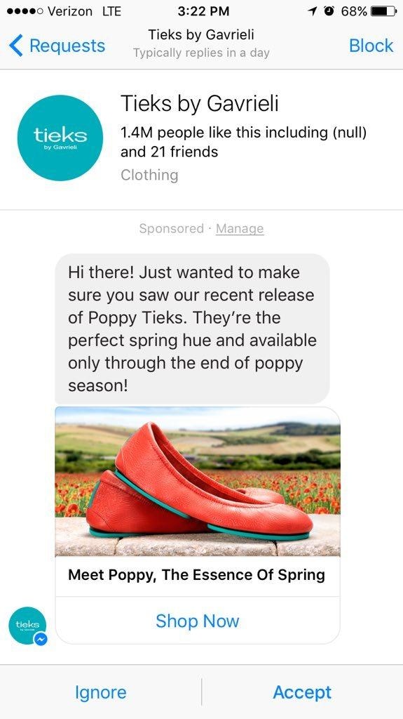 在这个Facebook Messenger广告的例子中,时装零售商Tieks by Gavrielli很好地利用了Messenger的赞助消息功能。