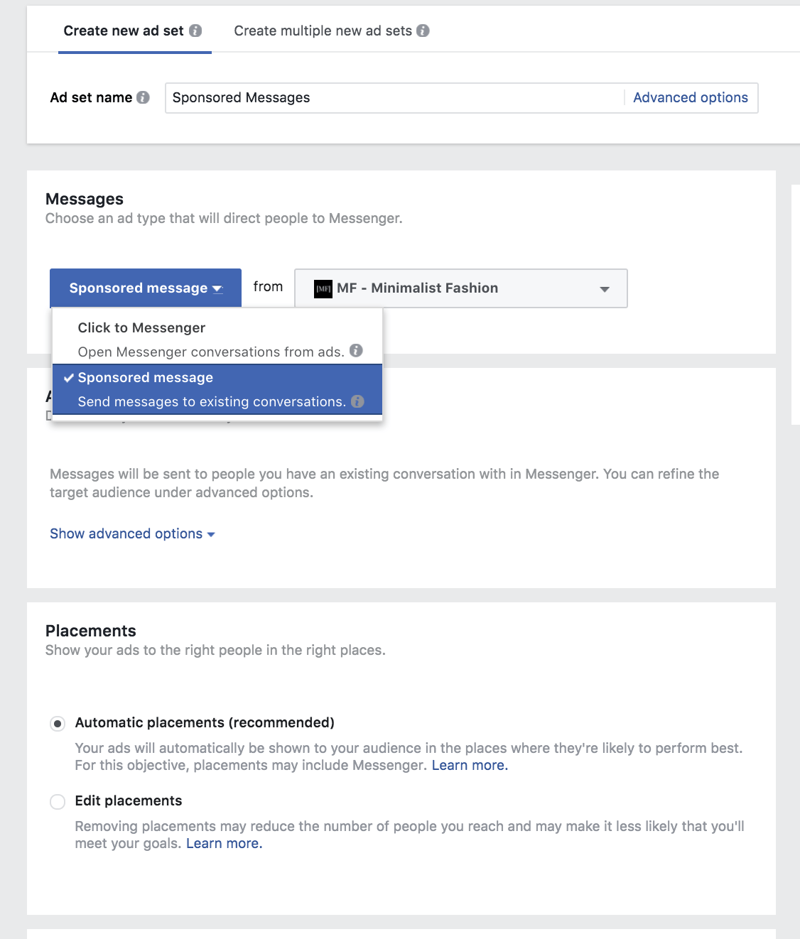 - 如果你正在使用自动放置,那么你当前的Facebook广告已经被放置在Facebook Messenger中。这是新的默认设置。如果你想禁用Messenger Home,你必须手动编辑位置并取消选择此选项。