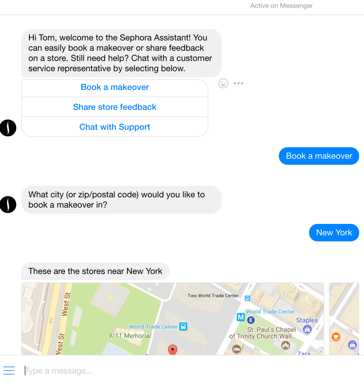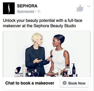 丝芙兰是首批使用Facebook Messenger聊天机器人的化妆品零售商之一。通过使用点击到信使的广告,鼓励用户与新的Facebook Messenger聊天机器人互动,该公司的预订率提高了11%。点击广告后,聊天机器人会自动在Messenger中启动,为用户提供3个选项。