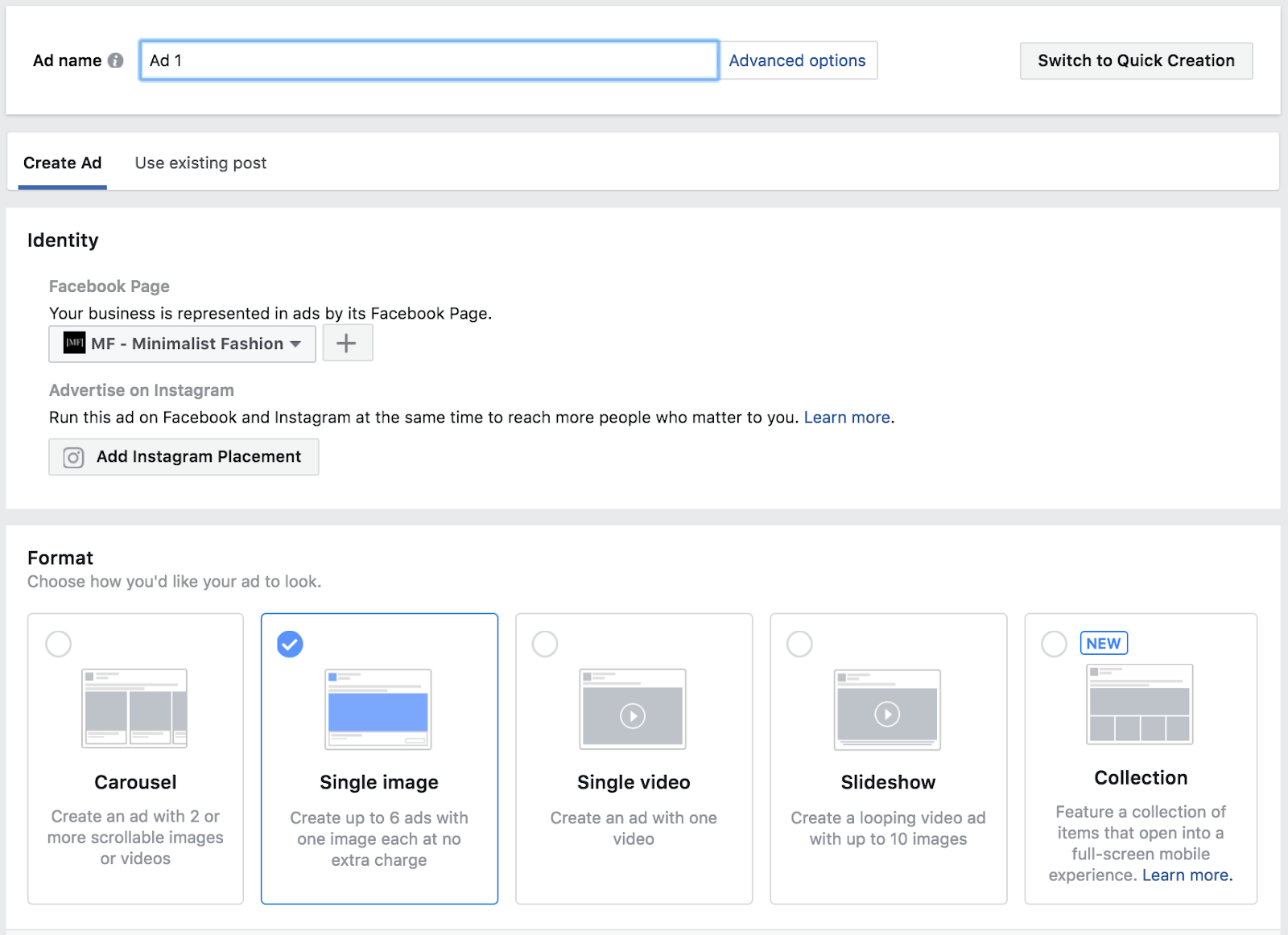 现在是插入广告的时候了。确保你想做广告的Facebook页面链接在下面身份,然后为格式选择单个图像。