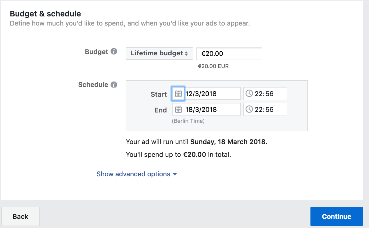 最后设定一个预算和时间表,然后点击继续。我们建议选择一生的预算,而不是每天的预算。这让Facebook有时间优化你的广告,并根据表现在不同的日子分配不同的数量。