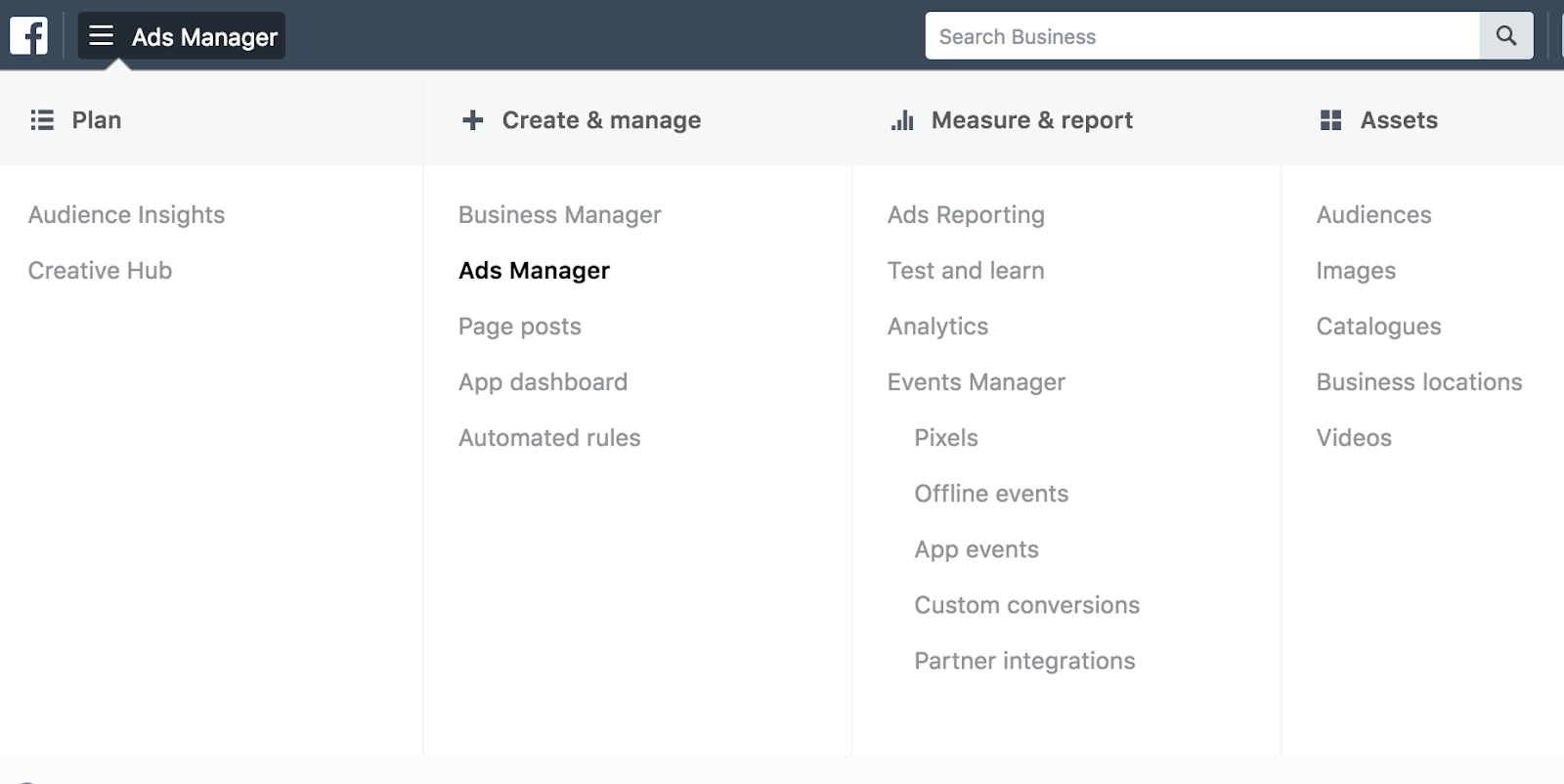 如果你是一个功能编辑器或广告管理器用户,你会注意到功能编辑器和广告管理器现在已经合并为一个。Facebook的Business Manager试图将两者的优点结合起来,允许用户在一个界面内管理他们所有的业务需求。