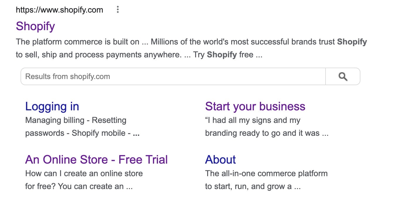 无论何时你在Google中输入一个搜索查询,你都会看到一个SERP(搜索引擎结果页面)。在这个SERP中,您将找到与您的搜索查询相关的各种结果。下面,我们放置了一张图片,它显示了“Shopify”的SERP摘录。