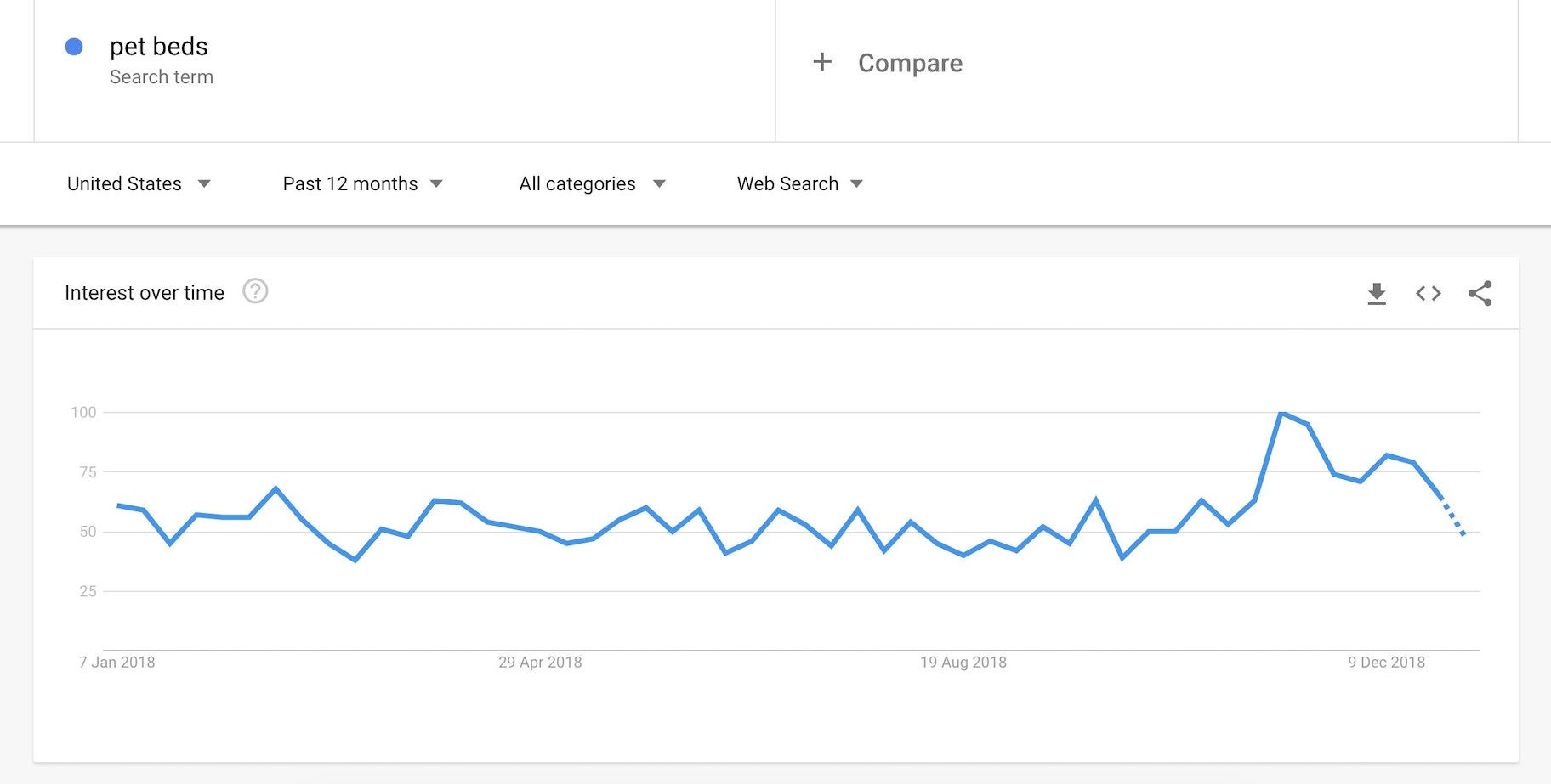 另外,如果我们看看谷歌趋势数据,我们可以看到宠物床在过去的一年里一直很受欢迎。