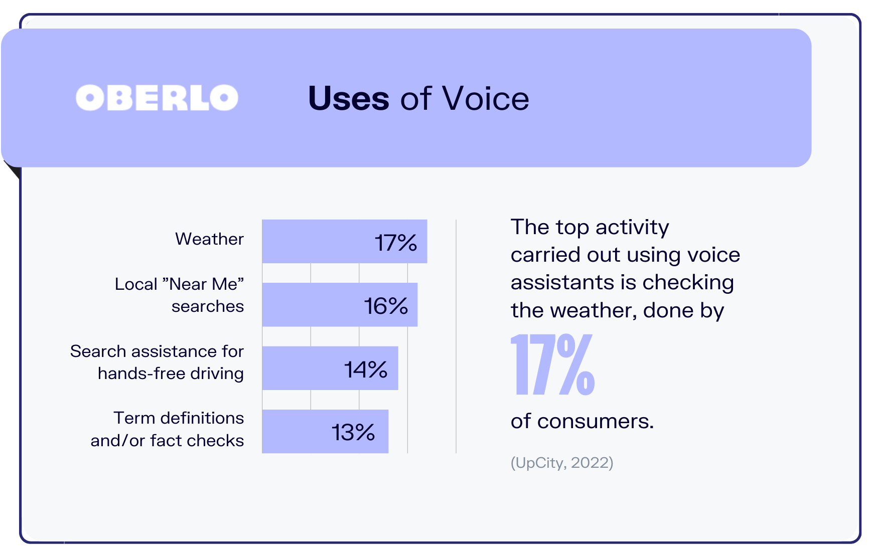 根据最近对语音搜索的使用情况进行的一项调查,用户给语音助手的首要任务是查看天气,以及周围的情况六分之一(17%)用户这样做(UpCity, 2022)。其次是搜索附近的场所,如餐馆和商店——16%的语音搜索用户执行。