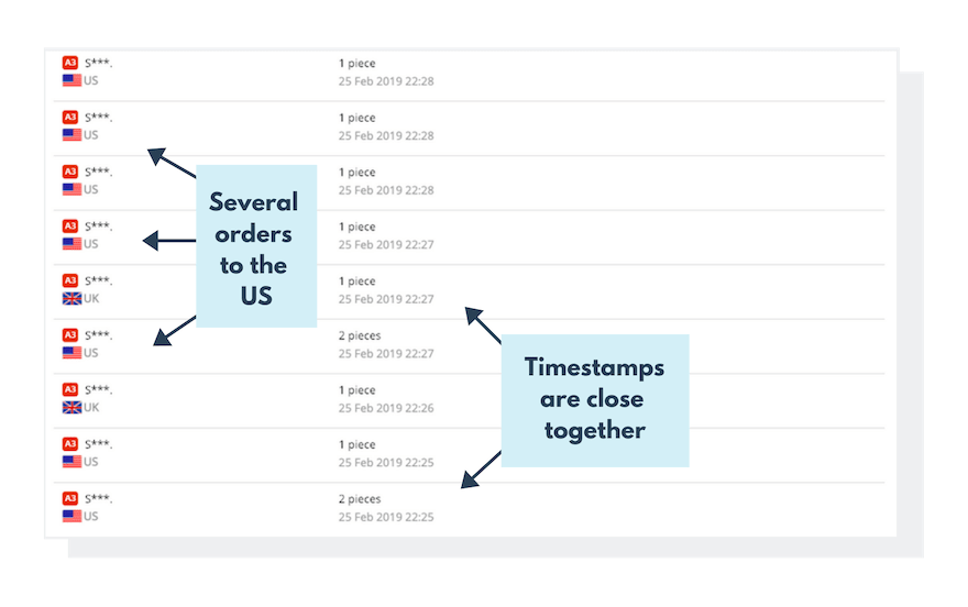 它们不只是一次性购买,因为在订单历史记录中,你通常可以知道某人是否在发货。如果有一串名字,他们很可能是dropshipping,特别是如果是到美国。