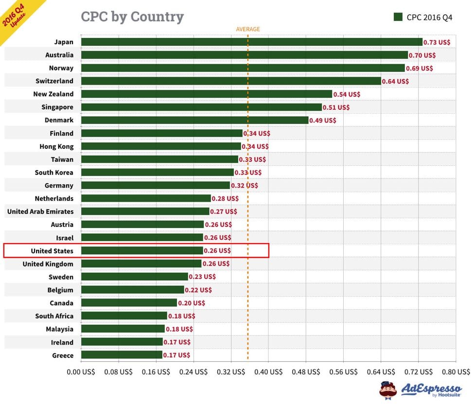 在一个研究根据AdEspresso的数据,2016年Facebook上的平均CPC(每次点击成本)在0.20美元到0.80美元之间。特别是在美国,每次点击的平均成本为0.26美元。
