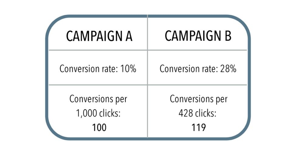 假设我们有两个广告活动——A和b。如果我们根据CPC和纯点击量来比较它们,我们可能会得到这样的结果: