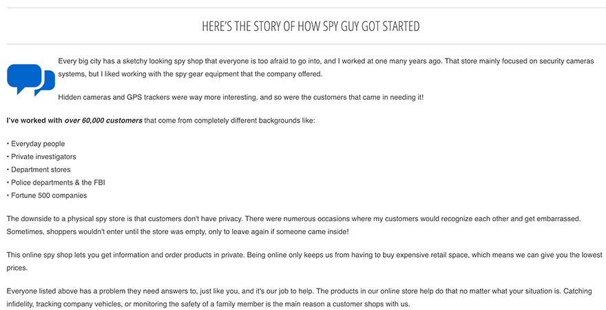 Spy Guysells products in an industry that can be seen as unethical. They sell products so that you can spy on people. However, they use their about us page to explain who their audience is, why they buy these products and why you should buy from their brand. Their about us page helps assure customers with their purchase by explaining the necessity for the products on their store.