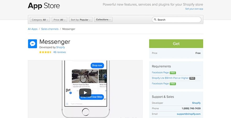 信使号通道是Shopify的另一个Facebook营销工具。这款应用程序可以让店主通过即时通讯工具向顾客销售产品。随着Facebook Messenger广告越来越受欢迎,这款应用将被证明对Facebook营销人员更加重要。截至目前,消费者可以使用这款应用跟踪购买、查看运输细节并轻松与品牌沟通。