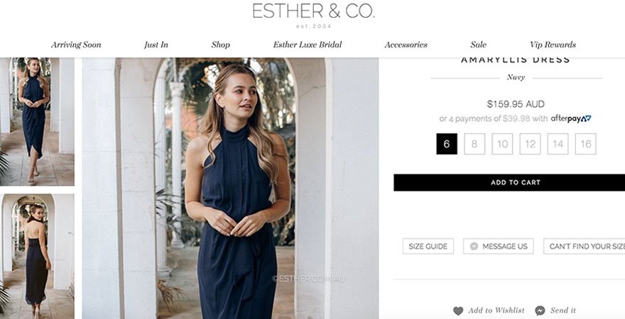 以斯帖在他们所有的产品页面上都有一个“消息我们”的Facebook图标。这有两个好处。首先,它允许客户在聊天中回答他们的产品问题,这通常比回复时间较长的电子邮件更受欢迎。其次,它允许零售商在未来向这些客户发送Messenger广告。请参阅我们的工具部分,了解如何在您的商店中添加Messenger图标。