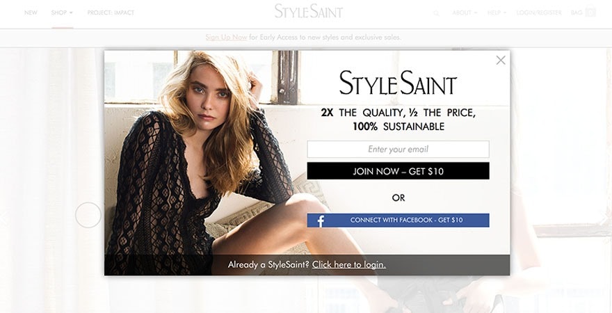 当客户来访时风格的圣一个弹出窗口会向他们提供10美元来连接Facebook。Facebook登录给店主带来了很多好处。它使顾客更容易登录该品牌的网站。这对于想要简化结账过程的店主来说非常有用。Facebook比客户第一次访问的在线商店更值得信赖。客户可能不想接收来自商店的电子邮件。但最重要的是,它让店主可以访问客户的Facebook数据,以便更好地向他们推销。这样做的缺点是,并不是每个人都有Facebook账户,这就是为什么在弹出式Style Saint中还包含了电子邮件选择选项。