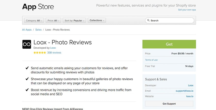 Loox是一个客户照片应用程序,允许客户将自己的照片添加到产品评论中。顾客照片是在你的商店建立社会证明的好方法。它们还有助于展示不同的外观和产品用途。它可以帮助您填写产品页面的图像集,这样客户就可以知道当他们看到您的产品时将会看到什么。客户将能够看到你的产品看起来像没有数字增强。