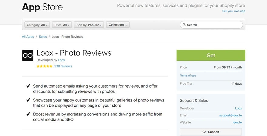 图片评论Loox是一个客户照片评论应用程序。客户照片评论可以帮助增加转换,使其成为一个伟大的应用程序的社会证明。发送电子邮件是为了在一个自动化的过程中获得评论。你可以自由地自定义应用程序的配色方案、邮件时间安排等。你可以调节评论,选择发布哪些评论。它甚至有一个丰富的片段集成,以帮助您的评级出现在搜索结果中。