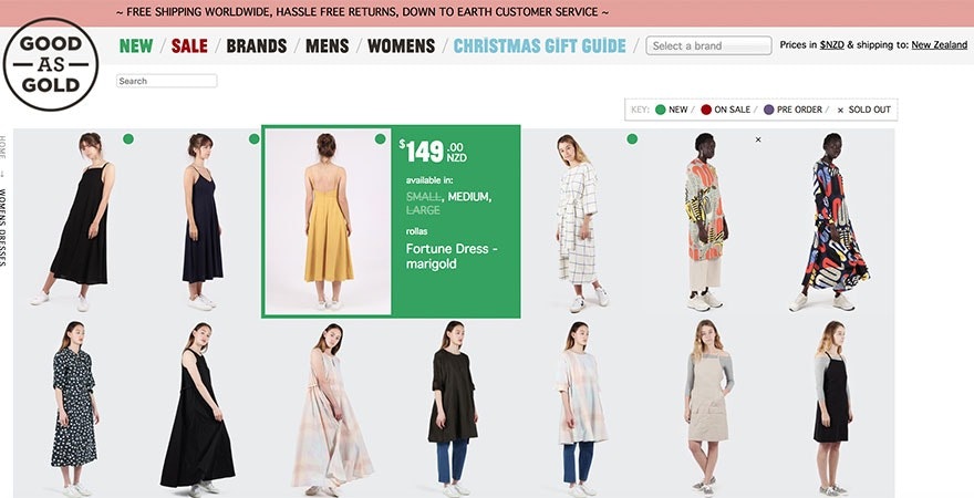 Good As Goldhas a unique product collection page. While customers browse photos, they can hover over an image to find product details. You’ll see details like price, available sizes, whether or not it’s sold out and the product name. This helps ensure that customers are ready to purchase by the time they get to the product page. They’ll know if their size is available and if the price matches their expectations.