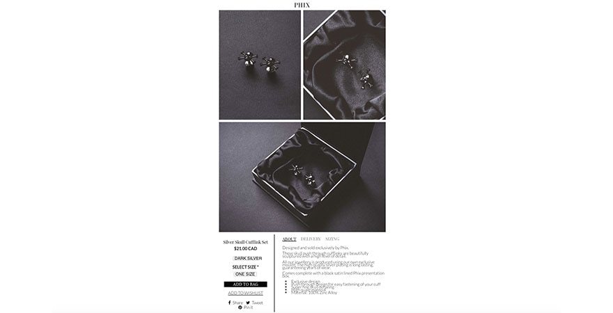 Website Design Ideas Example:Phix Clothinghas a unique website layout. While a top navigation is often most intuitive for most consumers, they’ve chosen to add their navigation on the left hand side. Another remarkable difference between Phix and the average ecommerce brand can be found on the product page. Their Call to Action (CTA) is found on the bottom of the page. Not above the fold. For a customer to find the ‘add to bag’ button, they need to browse ultra large product images that show great detail. After they’ve scrolled through the images, they’ll find a large black add to bag button with a striking contrast against a white background. While we don’t know how well this page converts, it may be a great split test experiment to run.