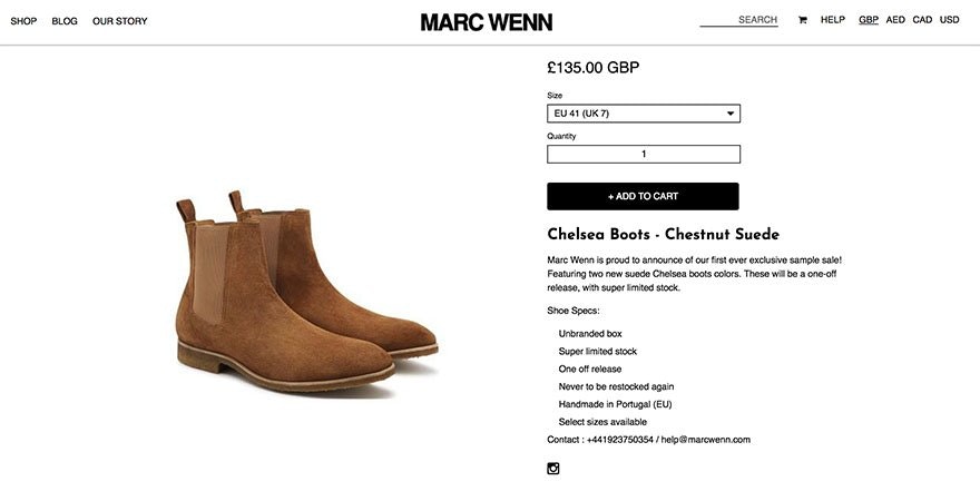 Marc Wennhas a unique product page design. When a customer scrolls, the product images change, however the product details and add to cart button stay static. This may help with conversions as the CTA stays above the fold despite scrolling.