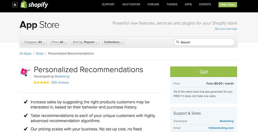禅。Ai产品推荐是另一个产品推荐应用程序,你可以安装在你的Shopify商店。这款应用是按业绩付费的,这意味着它是免费的,除非它有助于促进销售,这对预算紧张的企业家来说是件好事。顾客可以很容易地找到他们最近浏览的项目,为他们选择的首选,以及更多。