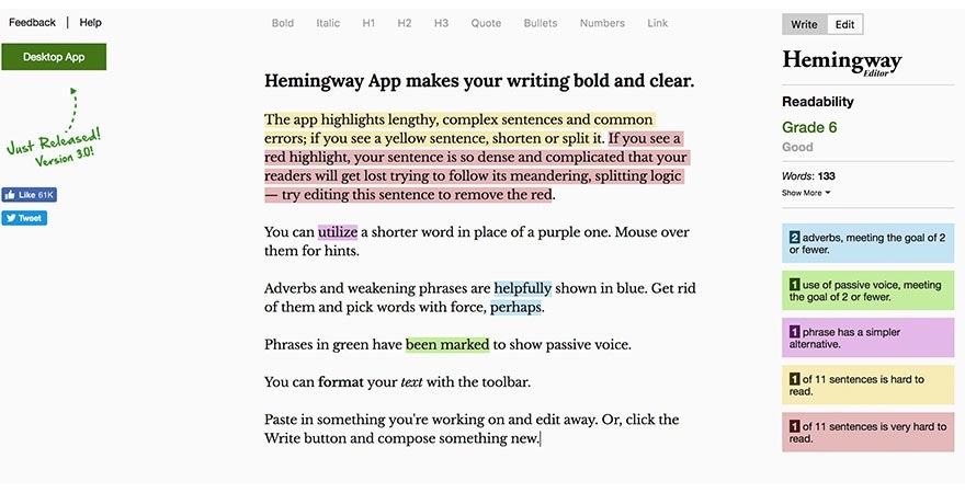 海明威的应用也可以用作语法工具。然而,它有一个很酷的功能是为你的内容的可读性打分。可读性分数告诉你你的写作水平。对于电子书和网络内容来说,年级越低,一般人读起来就越容易。目标是6年级或7年级。记住,你的一些客户可能不太懂英语。写一本人人都能读懂的电子书。