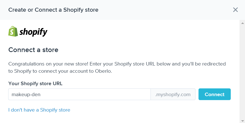 - 回到奥伯罗窗口。将会有一个新的弹出窗口,要求您输入商店的URL。从Shopify窗口复制并粘贴URL。这将是您键入的商店名称,只是在单词之间用破折号代替空格。