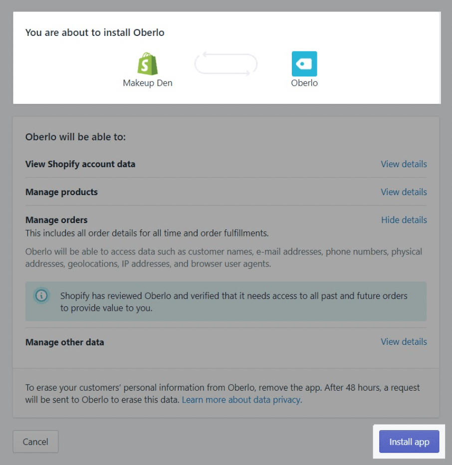 - 然后你会被带到你的Shopify仪表板,并要求将Oberlo安装到你的Shopify。向下滚动并单击“安装应用程序”。