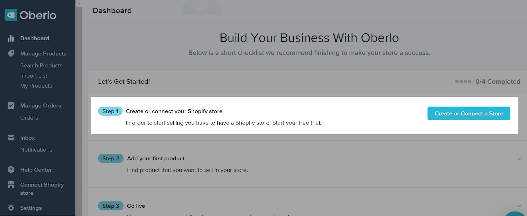 - 登录你在第一章中创建的Oberlo帐号。转到仪表板,在“步骤1”区域单击“创建或连接存储”。你会得到一个弹出窗口,问你是否已经有一个商店。点击“不,我还没有开店。”然后点击“创建你的Shopify商店”。
