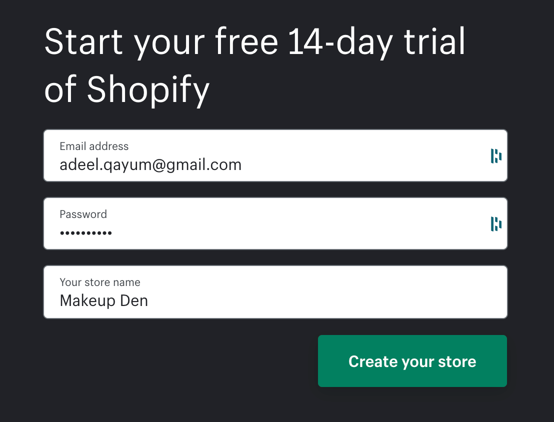 - 你会自动转到Shopify.com。点击主页右上角的“开始免费试用”。输入您的电子邮件,创建密码和企业名称,然后单击“创建您的商店”。
