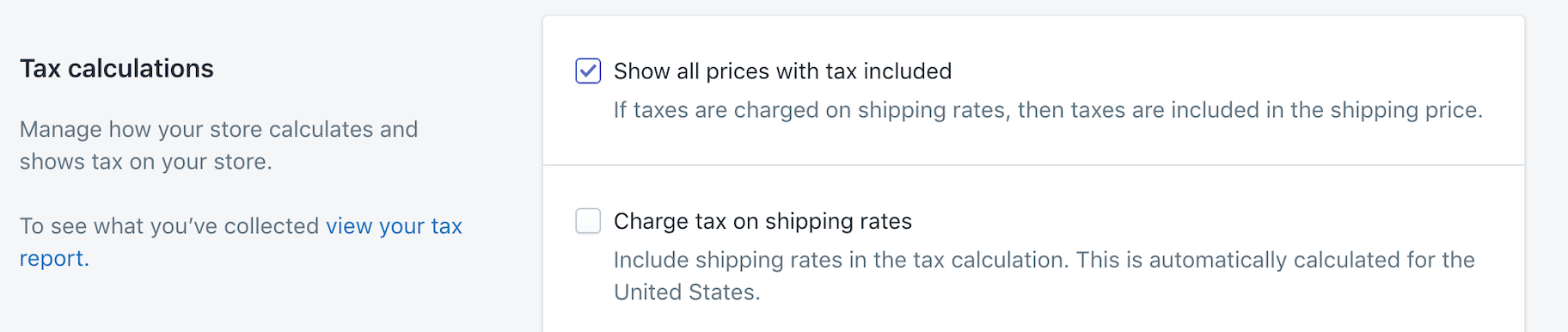 然后,转到“税收”。如果您只想在价格中包含税费,或者您希望客户根据他们购买的地点支付税费,请选择。在美国,这将基于他们的州/县/城市。在其他地方,这可能取决于他们的国家。