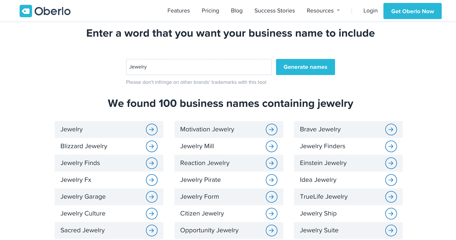 一个有用的工具来提出一个dropshipping商店名称是Oberlo业务名称生成器.