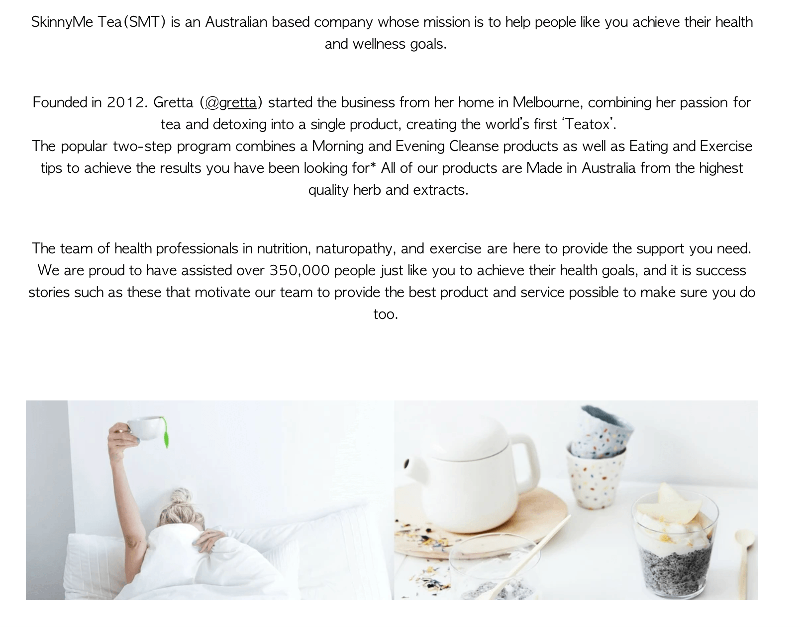 SkinnyMe Tea的品牌故事吸引了那些喜欢排毒的人(该品牌称其为teatox)。该公司表示,他们已经帮助35万人实现了健康目标,并将积极的体验与他们的产品联系起来。这个故事很有效,因为它帮助潜在买家想象使用它的产品会变得更好。