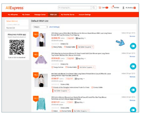 如果您已经安装了我们的应用程序,请转到您的阿里巴巴全球速卖通的清单并导入您之前收藏的所有产品。
