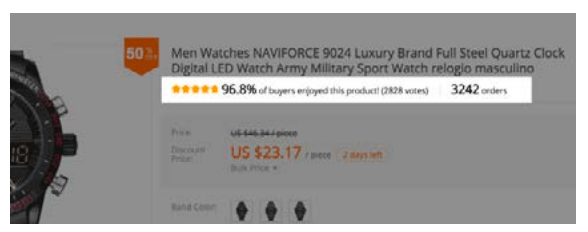 您还应该考虑个别产品的反馈和订单数量。购买一款被订购了几千次、正面反馈得分为90%的产品,要比购买一款只卖过两次、正面反馈得分为100%的产品安全得多。寻找任何不满意的客户。通常,不满意的客户帮助识别可能的产品缺陷和问题。