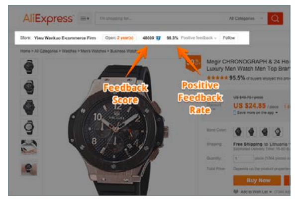 在评估AliExpress.com卖家时,最重要的两点是他们的产品反馈得分和正反馈率。反馈分数表示卖方的销售量,而正反馈率表示供应商收到的反馈率。始终以95%或更高的积极反馈率为目标,反馈得分至少为2000分。