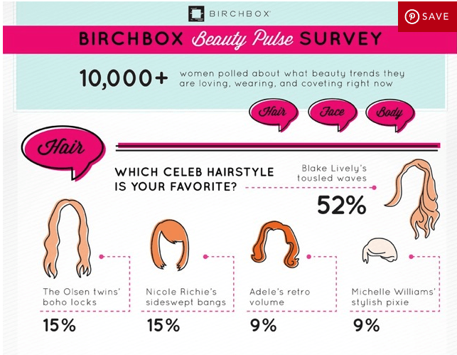 订阅美容盒公司Birchbox创建了一个信息图表,说明了关于女性的脸,头发和身体的偏好和意见的民意调查结果。这里有一个预览: